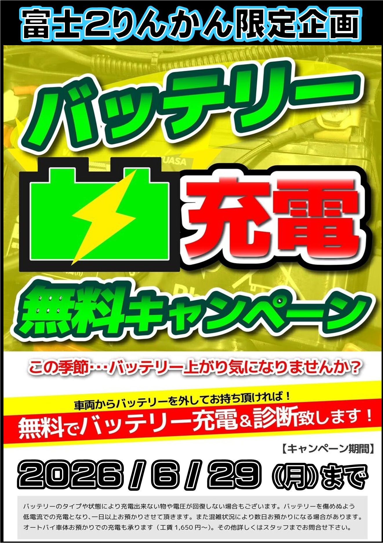バッテリー(単体)無料充電いたします!!