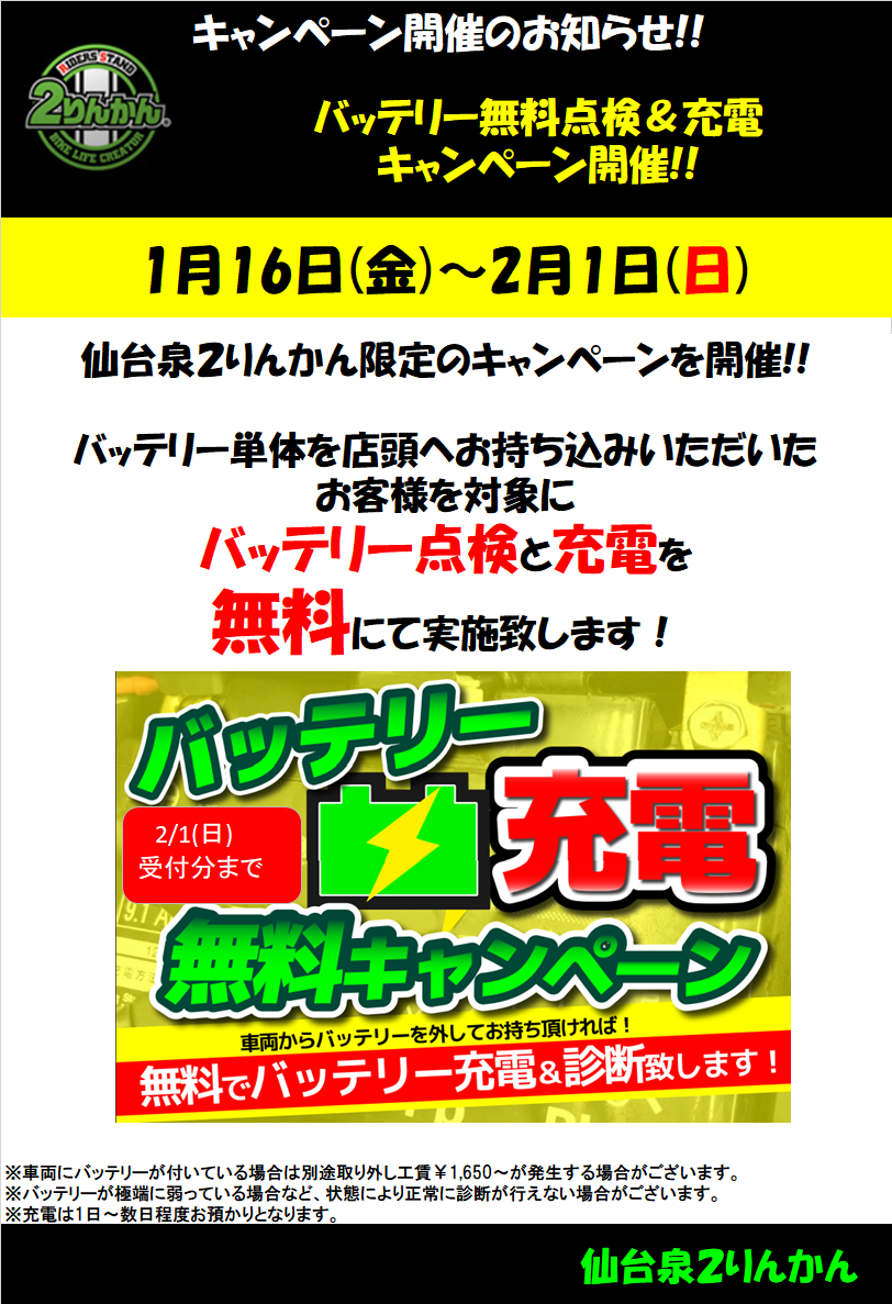 2月1日迄バッテリー無料点検・充電キャンペーン開催中!