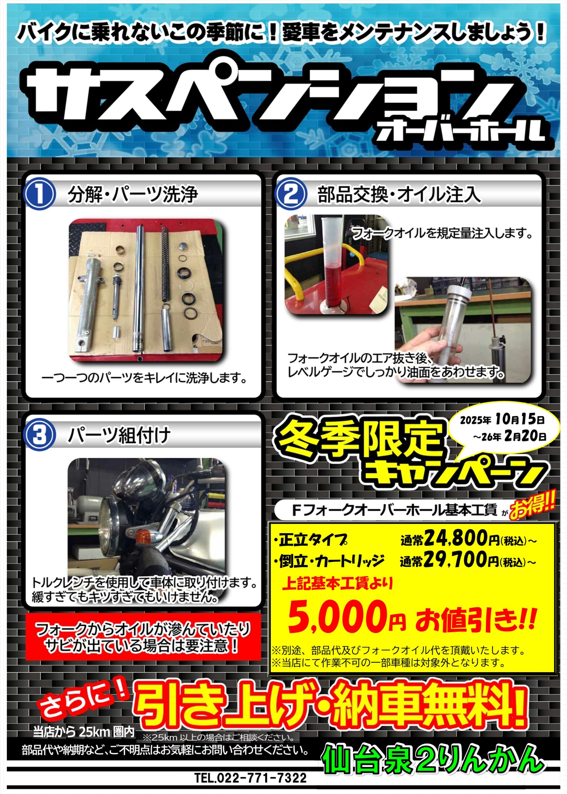※当店にてフロントフォークOH作業が不可能な一部の車両はキャンペーン対象外とさせていただきます。