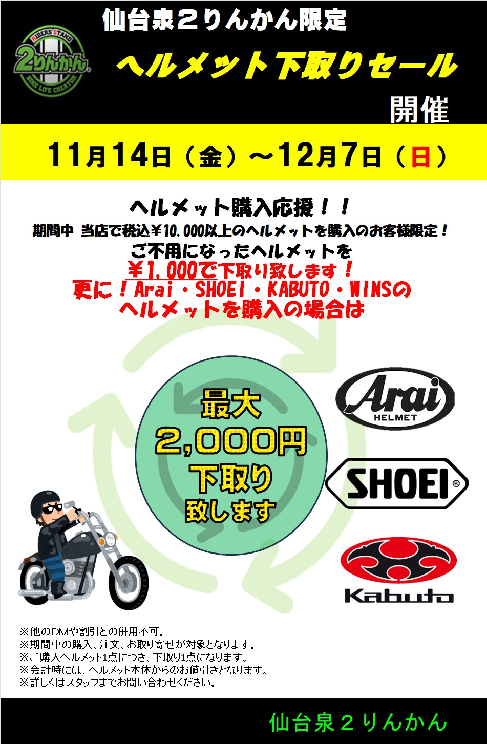 さらに!ARAI・SHOEI・KABUTO・WINSのヘルメット購入の場合には¥2,000で下取り!