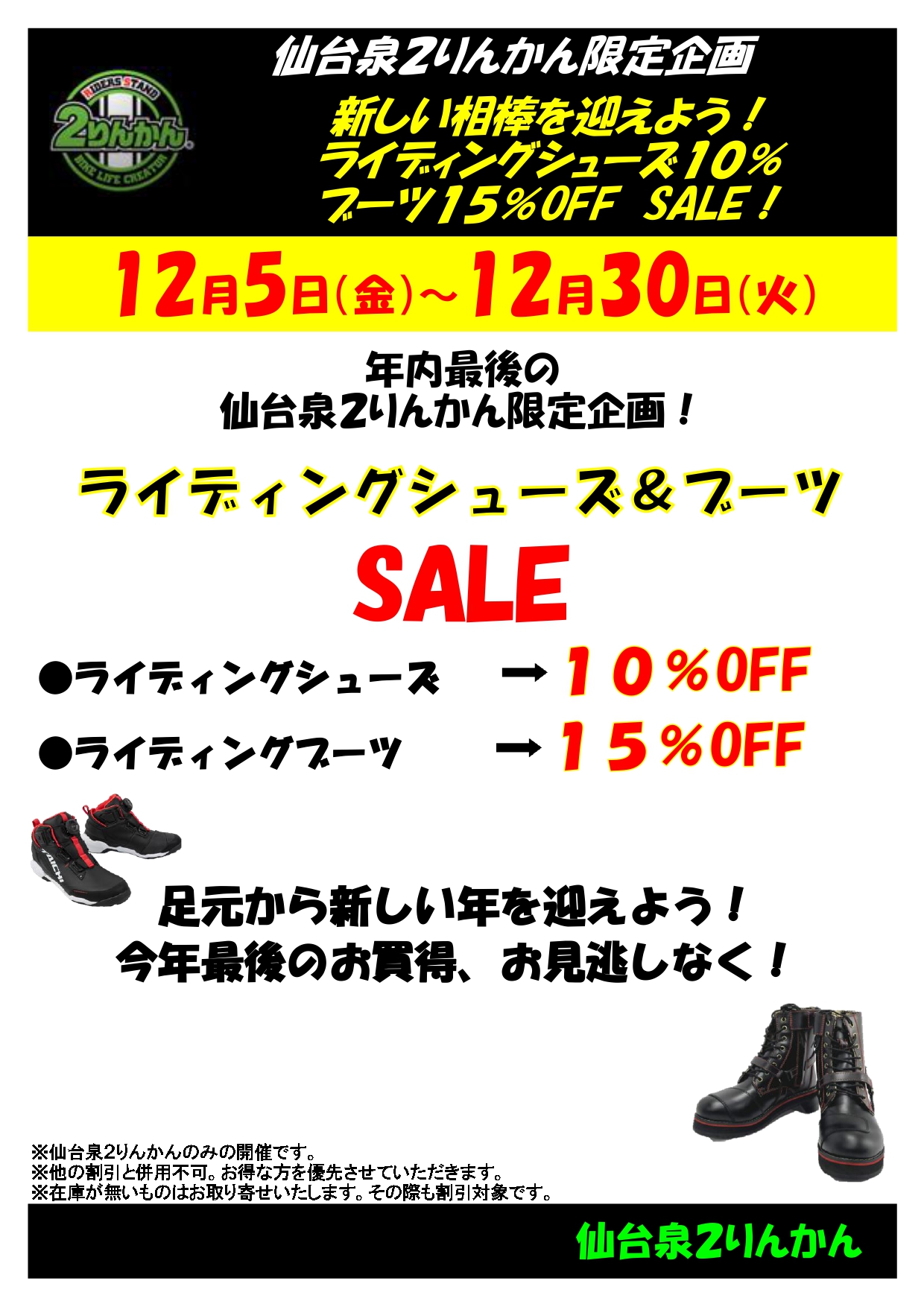 仙台泉2りんかんでは、年末に向けてライダーの皆さまを応援する特別企画として、ライディングシューズ&ライディングブーツの期間限定セールを開催いたします!