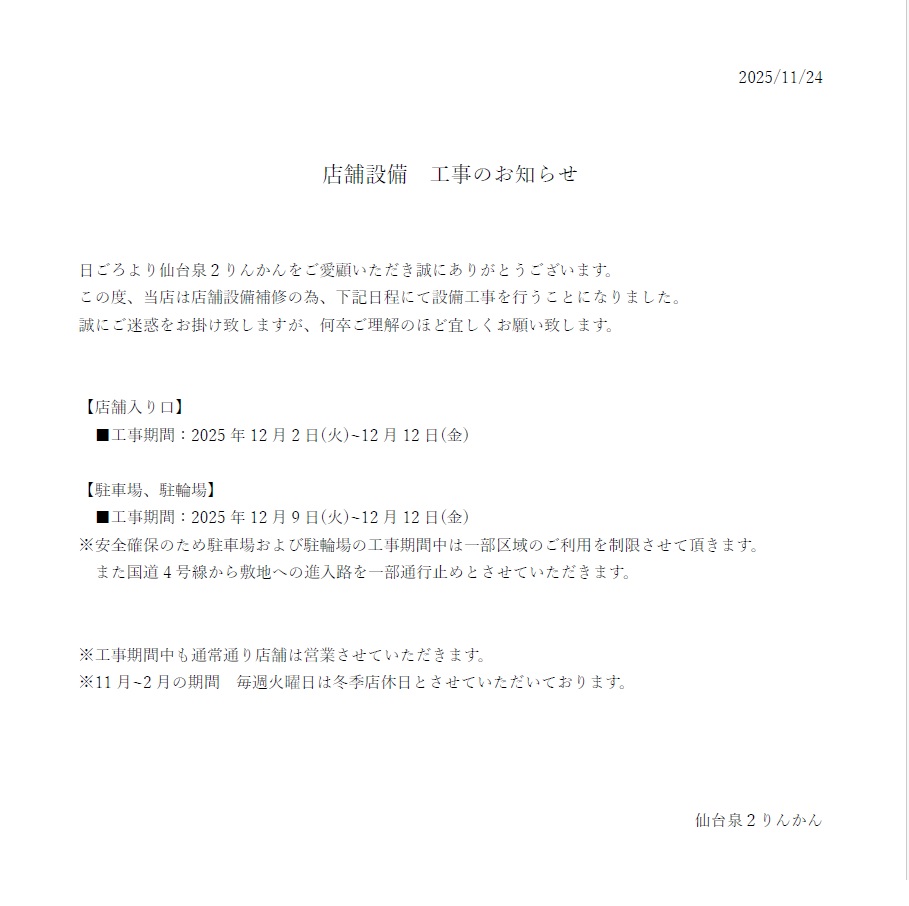 仙台泉2りんかんでは下記日程にて工事を実施いたします。