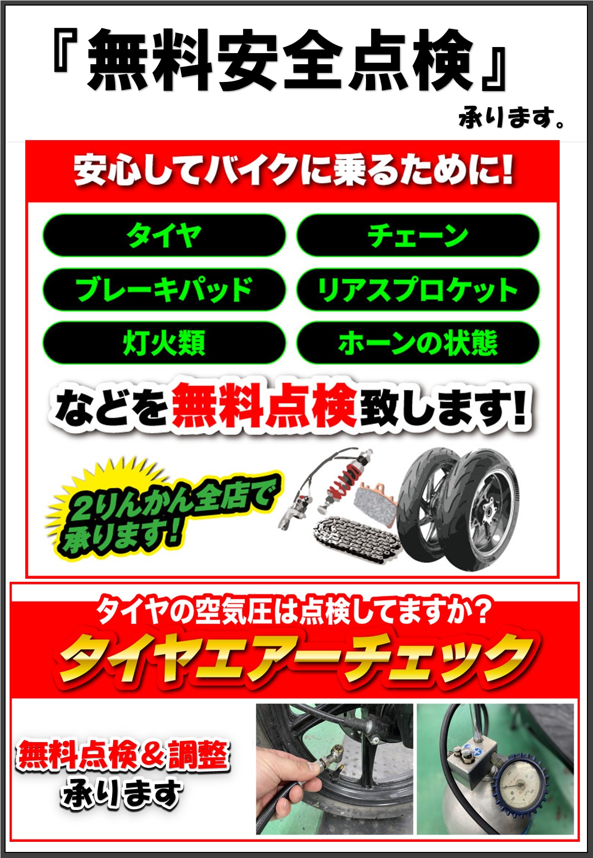 気になる消耗品の状態や空気圧など日常点検の項目をまるっとチェックいたします!