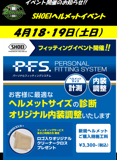 ヘルメットのサイズが合わずモヤモヤした経験のある方必見!一人一人の頭の形に内装を調整し快適走行をお手伝いします。当日は正規販売代理店の岡田商事スタッフが丁寧に計測し施工を行います。当日SHOEIヘルメットをご成約いただいた方はロゴ入りオリジナルクリーナーをプレゼントします♪調整料金は3300円別途必要