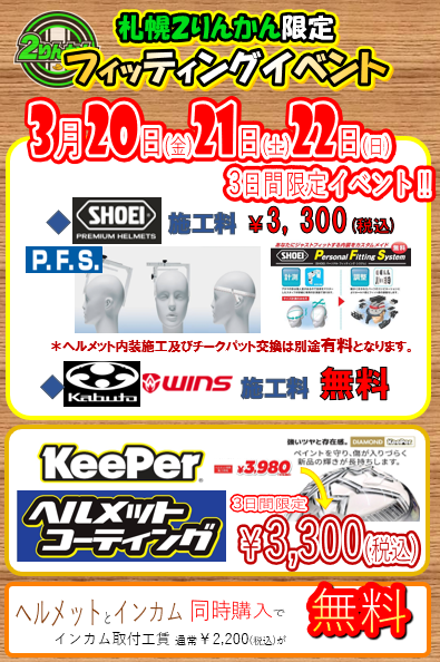 春にヘルメットを新調する方に朗報です♪札幌2りんかんはそんなお客様の為にヘルメット購入をお手伝いさせていただきたくフィッティングイベントを開催いたします。SHOEI・KABUTO・WINSのヘルメットメーカーの内装調整を行います。※SHOEI調整料金3300円、KABUTO・WINSは無料で実施