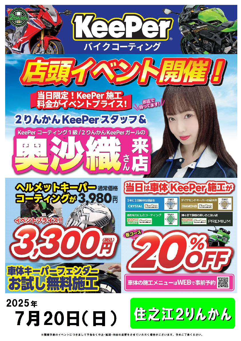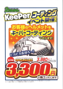 キーパーコーティングの仕上がりは大変美しいものです。その美しいキーパーコーティングをヘルメットにも施工してみませんか?新品ヘルメットに施工すると新品以上の輝きになります。住之江2りんかんではキーパーコーティングの施工ができます。専門の教育を受けたスタッフが実施しますので安心です。今お使いのヘルメットも施工できますのでお気軽にお声掛けください。施工価格は1個税別3980円となります。