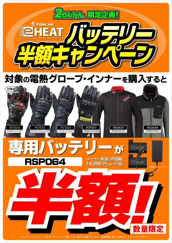 現在、松原2りんかんではe-HEATバッテリー半額キャンペーン開催中です!