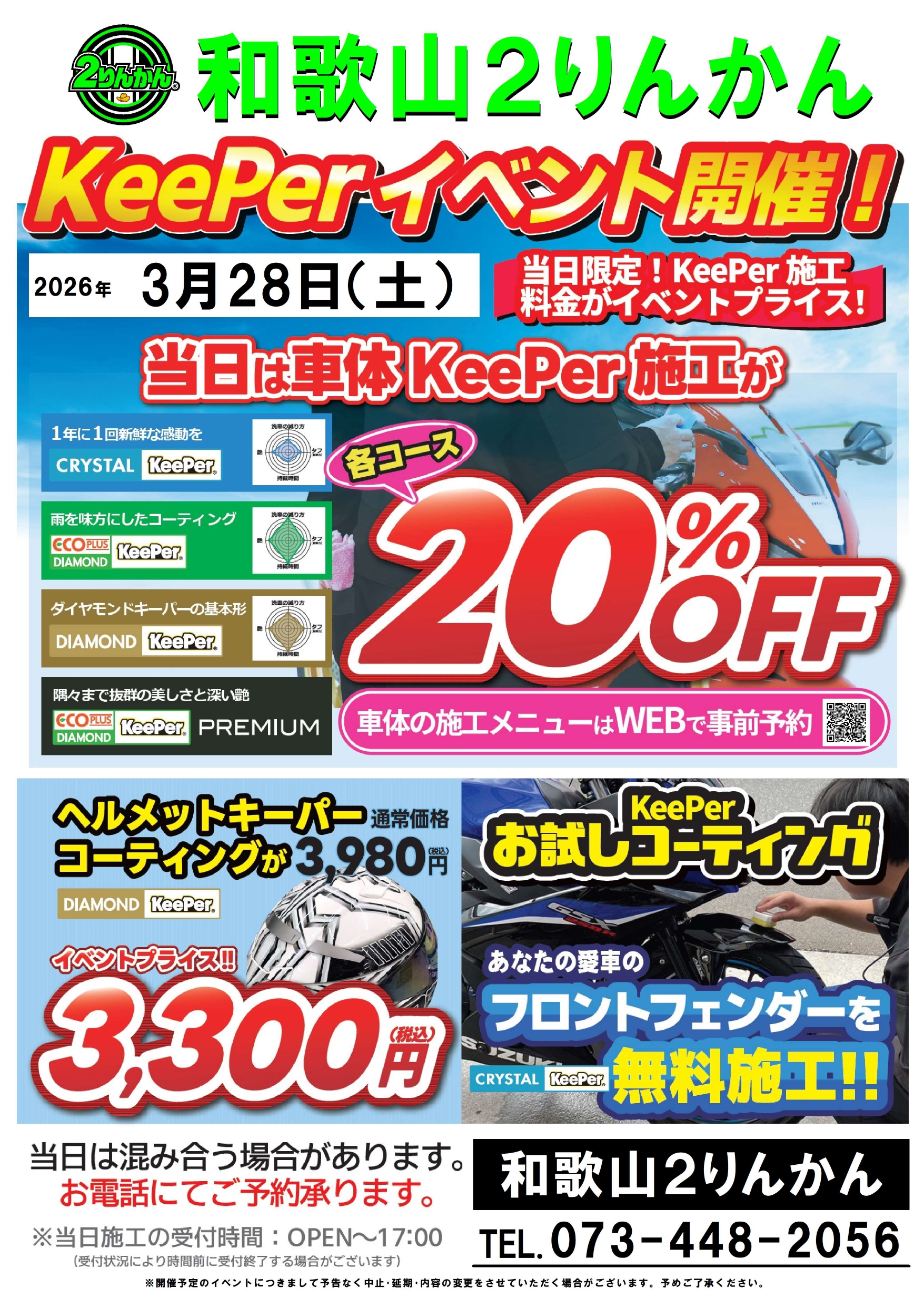 3月28日(土)に大好評のキーパーコーティングを全コース20%オフで施工できるイベントを開催致します。