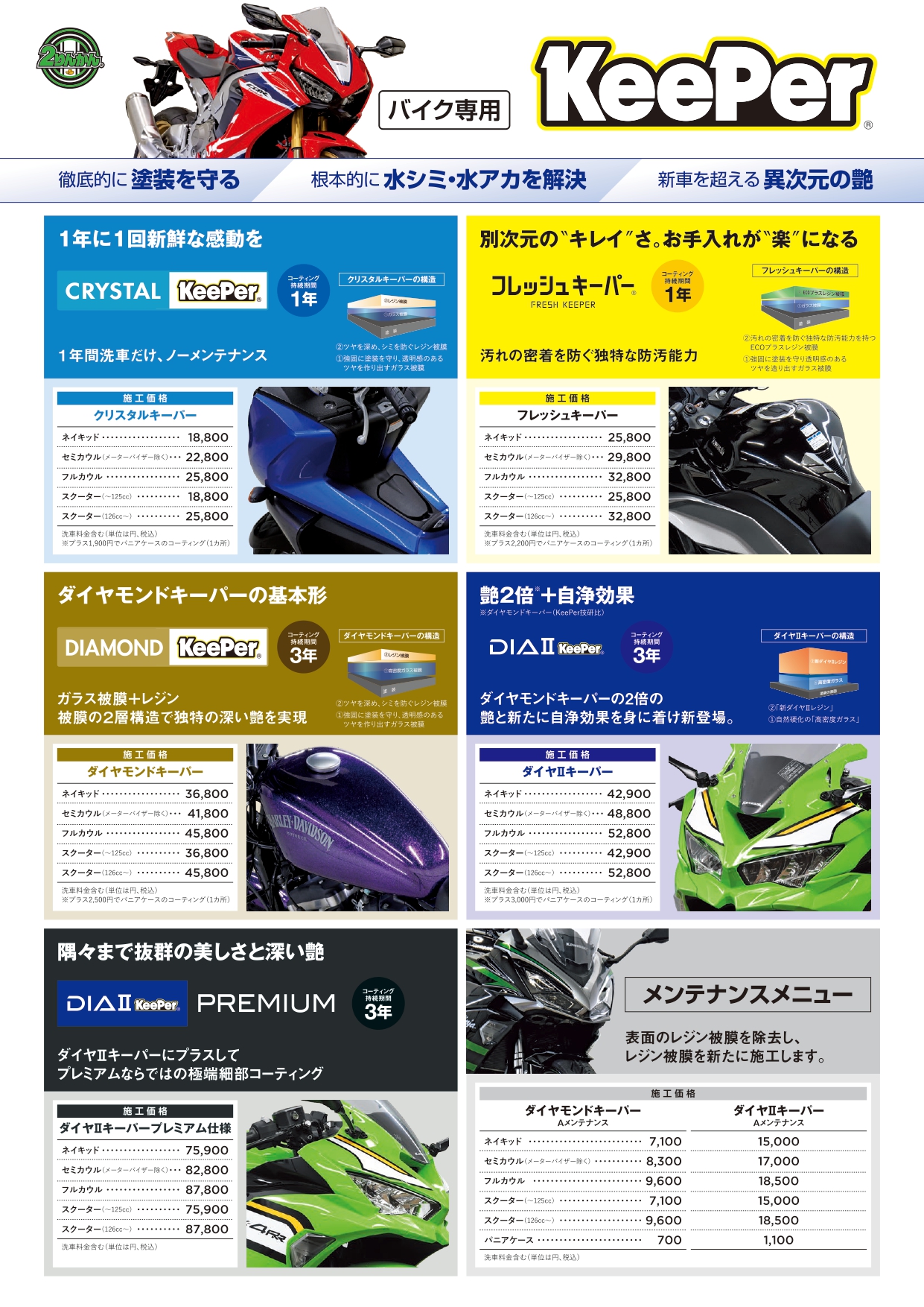 KeePer新メニュー開始!フレッシュキーパー&ダイヤⅡキーパー&ダイヤⅡキーパープレミアムです。フレッシュキーパーは汚れの密着を防ぐ独特な防汚能力を持ち、ホコリが降り積もっても塗装表面には密着せず、自然の雨が降れば元々持っている撥水力で雨と一緒に汚れが流れ落ち、まるで洗車をしたようにキレイになります。ダイヤⅡキーパーはKeePerの原点「ダイヤモンドキーパー」が、新しい輝きとコスパで「ダイヤⅡキーパー」として生まれ変わりました。 ダイヤモンドキーパーが築いた信頼の上に、最新ケミカルが生み出すダイヤモンドキーパーの2倍の艶(KeePer技研比)と自浄性能を手に入れた、19年ぶりの大進化。ガラス被膜の深い艶に加え、 「雨が洗車になる」自浄効果で洗車回数が激減します。洗車の負担が軽くなり、美しい艶で輝く愛車を、是非お楽しみください。ダイヤⅡキーパープレミアムはバイクの外装は特殊なコーティング表面の分子構造の効果で、抜群のメンテナンス性と圧倒的な艶と美しさを維持します。 加えてハンドル周り、フレームにはダイヤモンドキーパー、フェンダー、樹脂部分は樹脂キーパー、ホイールコーティングやスクリーンコーテイングが加わったプレミアムなコーティング。