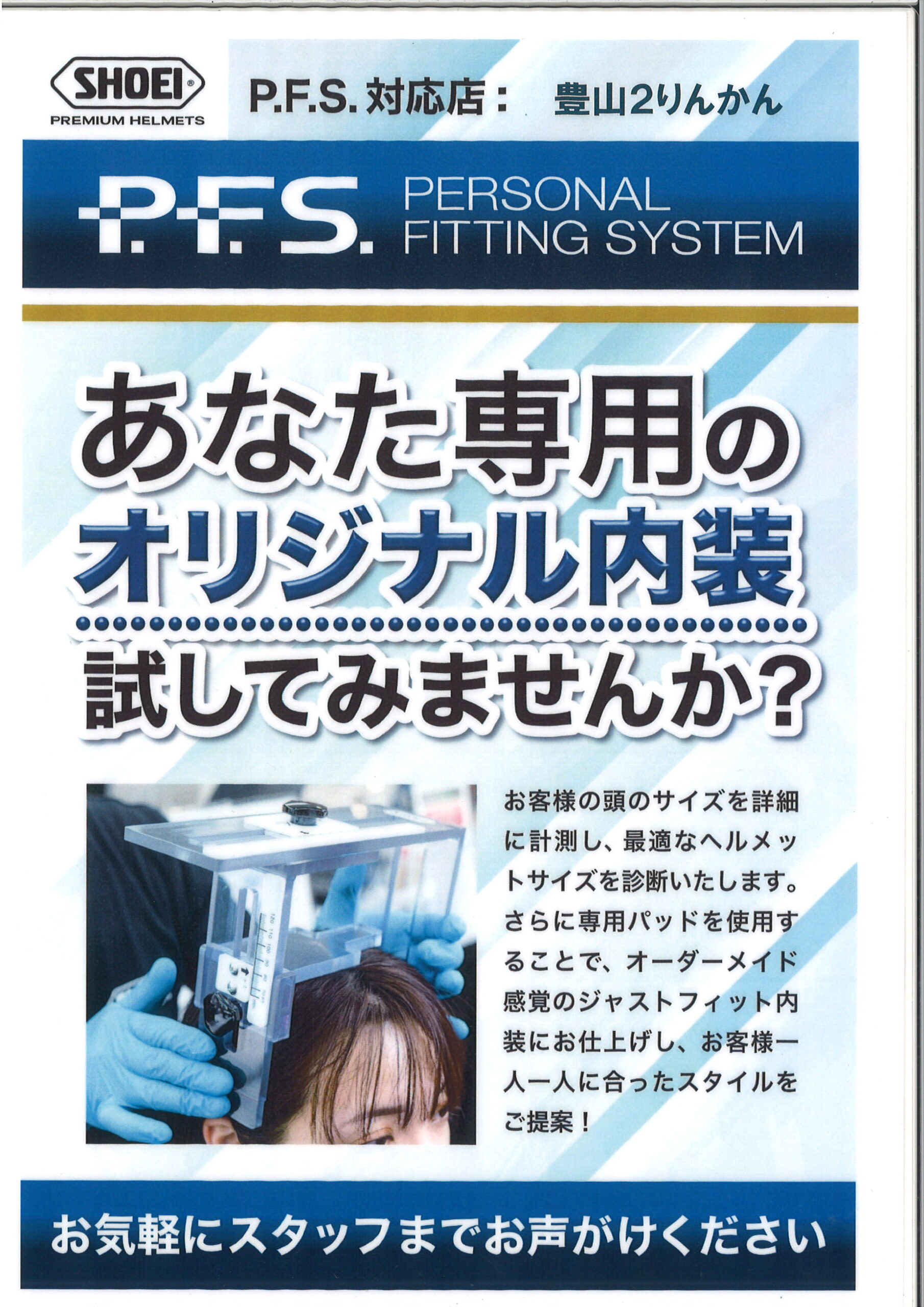 SHOEIはP.F.S店舗です。お客様の頭の形に合わせてフィッティングさせて頂いております!!