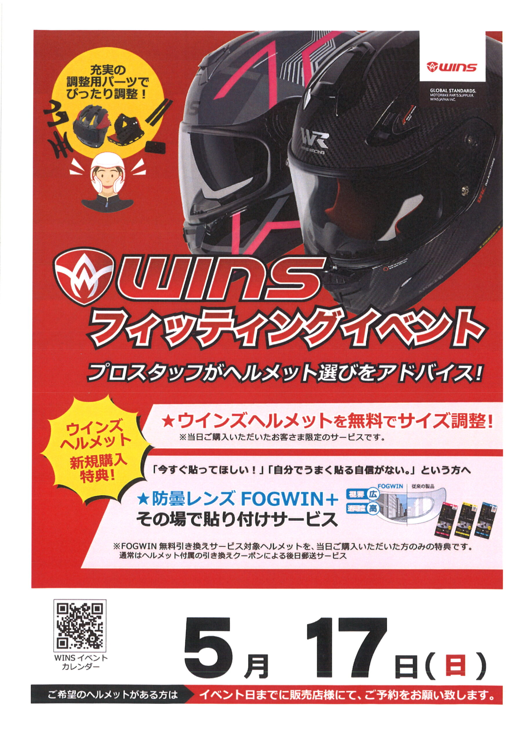 5月17日はWINSヘルメット フィッティングイベント開催致します。