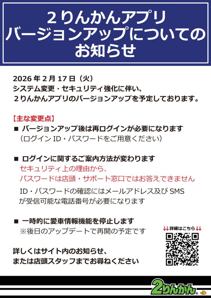 2りんかんモバイルサイトご提供終了および2りんかんアプリバージョンアップのご案内